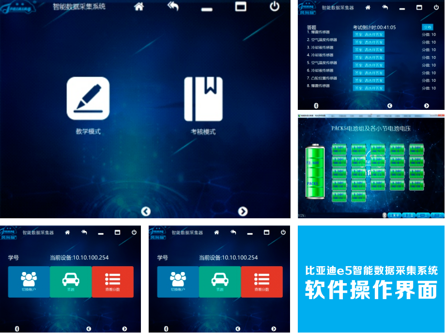 比亞迪e5智能數(shù)據(jù)采集系統(tǒng)網(wǎng)絡(luò)版是一種整車數(shù)據(jù)采集、診斷、故障設(shè)置為一體的多功能教學(xué)終端,通過CAN總線和比亞迪e5版本新能源汽車OBD相連,實現(xiàn)整車的數(shù)據(jù)采集、故障設(shè)置、故障碼讀取與清除;并通過電腦軟件顯示整車內(nèi)部詳細數(shù)據(jù);智能數(shù)據(jù)采集器與電腦之間的通訊采用USB有線和藍牙無線、WiFi通訊三種傳輸模式,PC端軟件分為教師和學(xué)生機軟件。